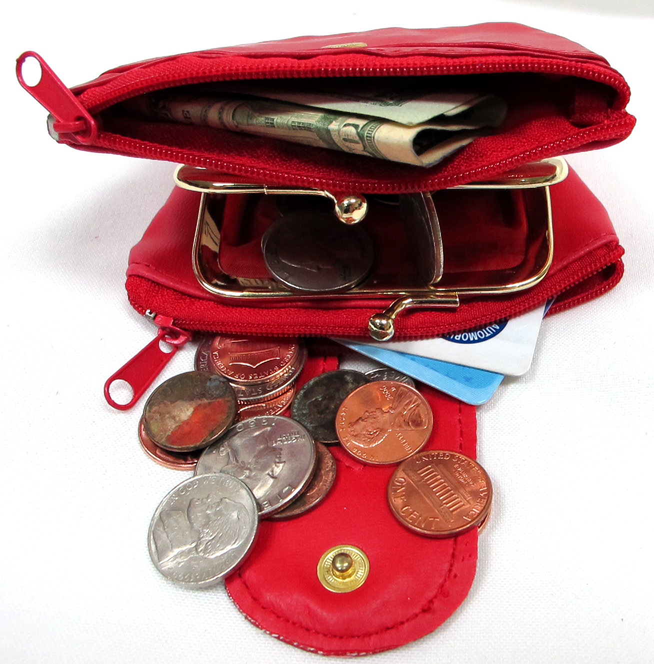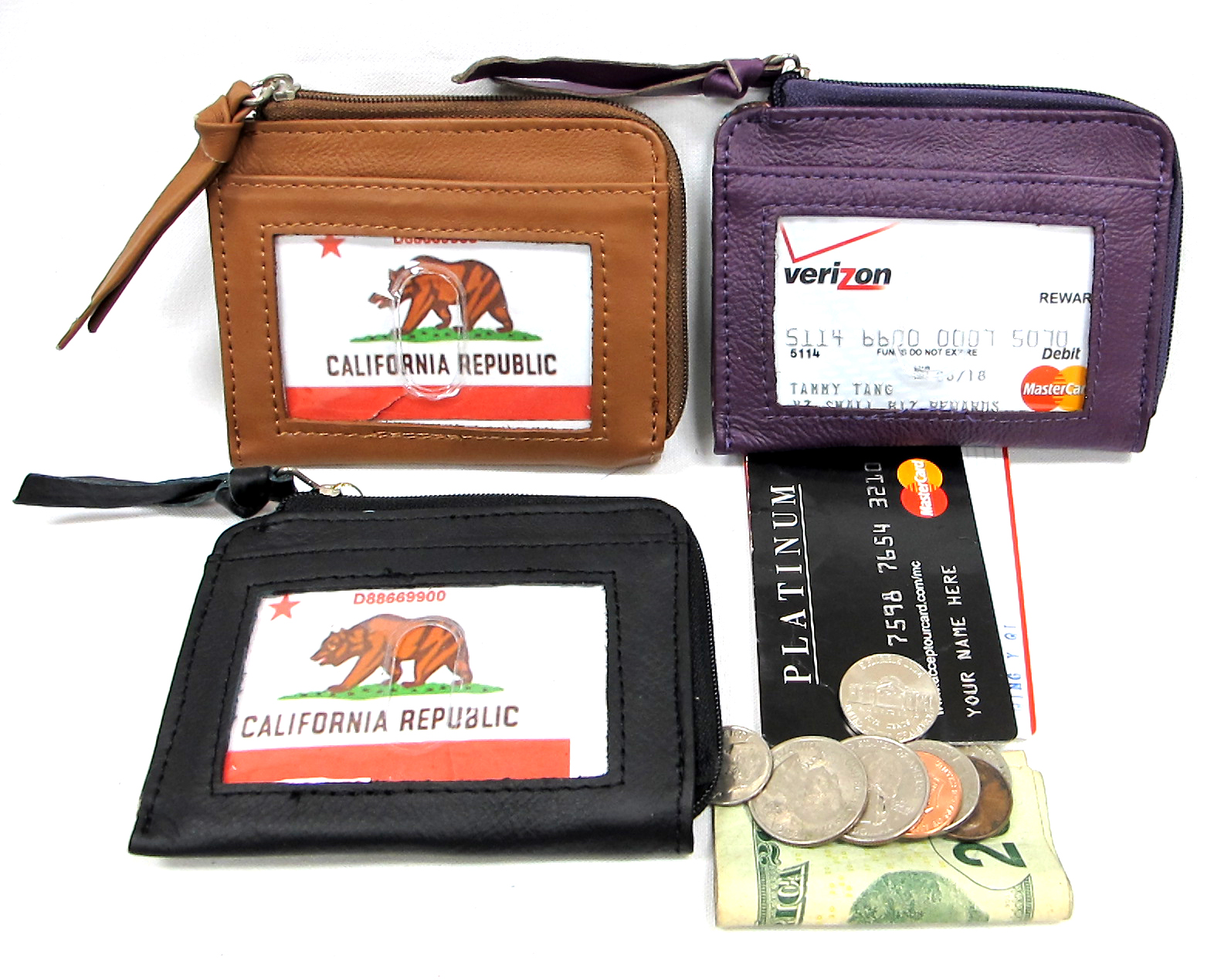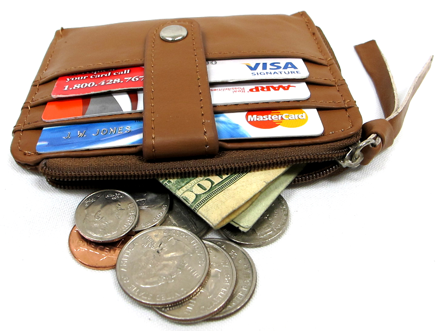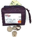 Snap top, C/C slots inside Hold card, change & cash