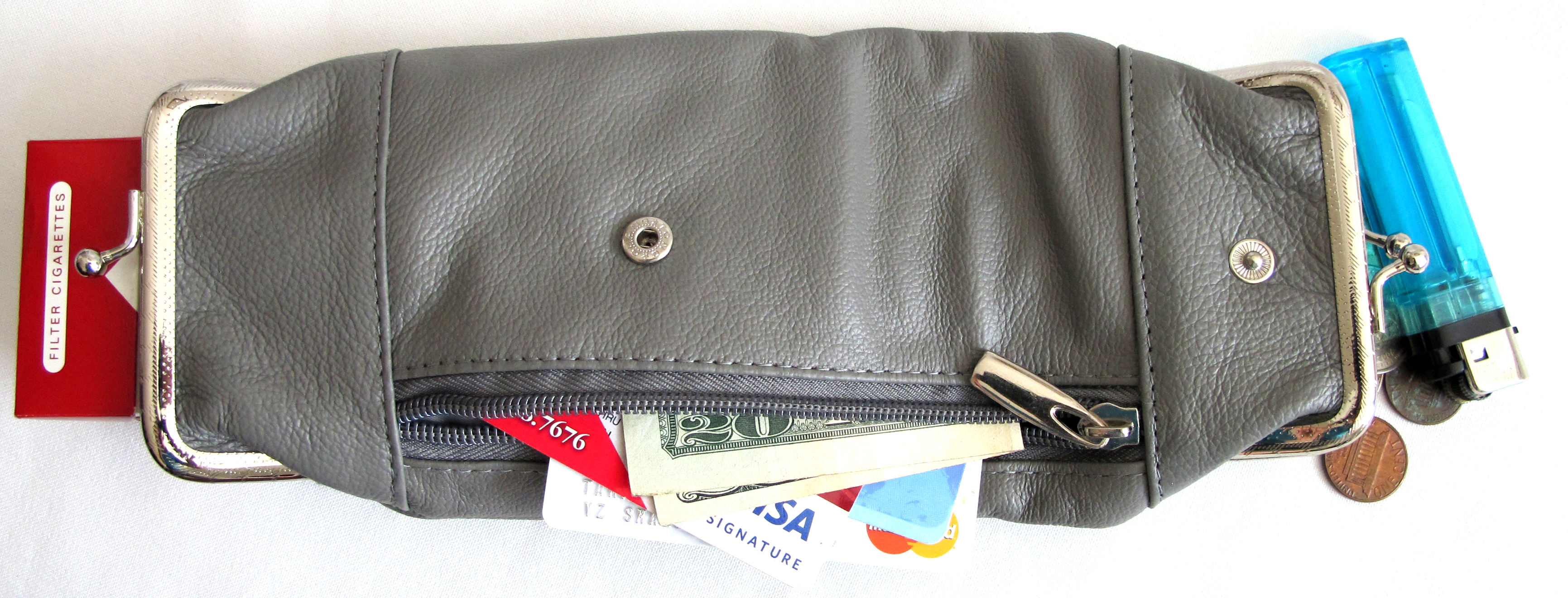 . Fold-able design with snap to make it compact and easy to carry . Extra zipper pocket for your cash, match, lighter, cards and change.